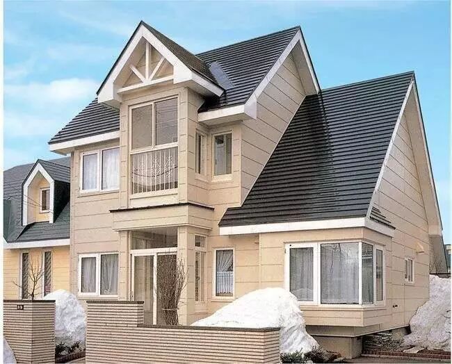 石膏基喷筑墙体成型,外表面可以用各种装饰性板材,如石材、真石漆或挂板材料等。看,用真石漆+仿古砖装修好的外墙,既大气又美观,又有一点儿文艺范!