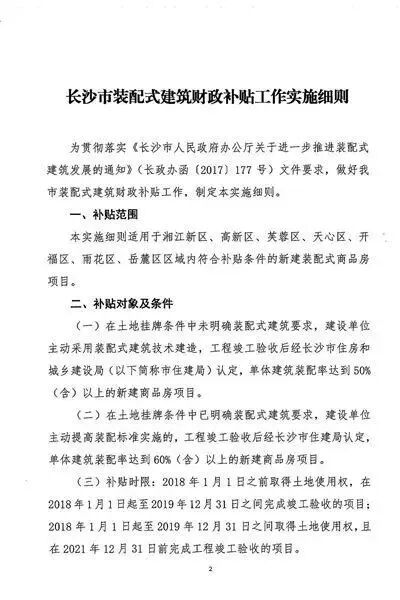 根据《实施细则》,补贴范围主要包括湖南湘江新区、长沙高新区、芙蓉区、天心区、开福区、雨花区、岳麓区区域内,符合补贴条件的新建装配式商品房项目。
