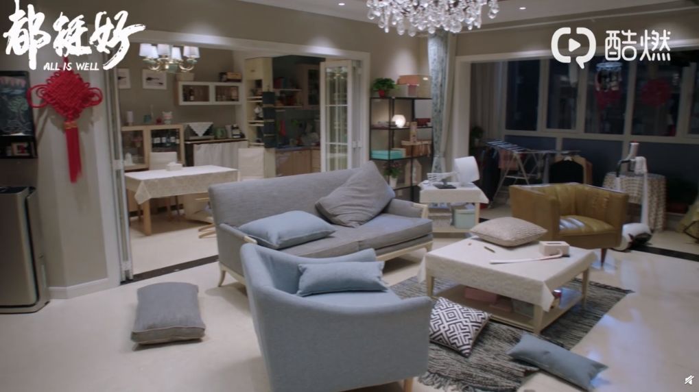 他们的家运用了蓝白二色,搭配得清新梦幻,从侧面可以窥见小夫妻甜蜜的日常,和朱丽不曾泯灭的少女心。苏明成集父母万千宠爱,朱丽也是家里的小公主,客厅的水晶吊灯就很符合他们的特征,生活品质中偏上,但欠缺了大气和内涵。