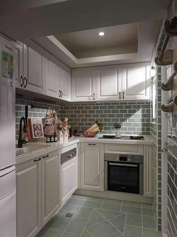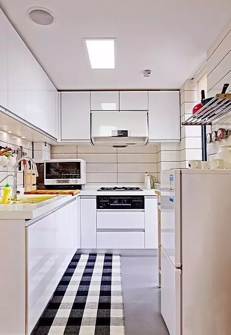 最合理的厨房布局依次是清洗区、切菜区(准备区)、烹调区流水线的摆列。洗漱区不宜离烹调区太近,因为水气会弄到燃气炉。L型的厨房是比较理想的设计。