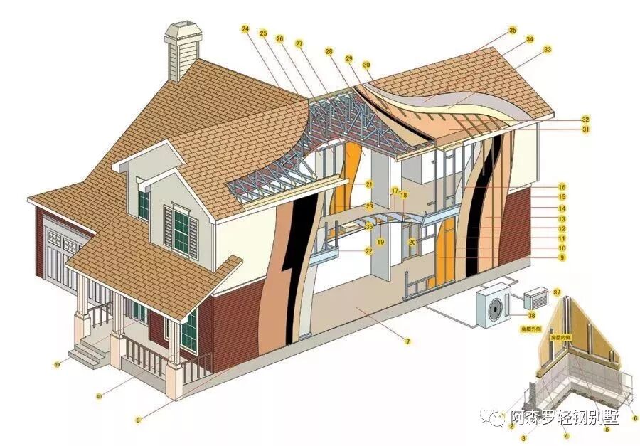 砖房房材料隔热效果差夏天热/冬天冷,大部分房顶增加半层用来隔热,同时又增加了成本,轻钢别墅复合墙体由玻璃纤维棉与挤塑保温板相结合,避免了墙体的“冷桥”现象,375px组合墙体相当于砖墙1米的保温效果。