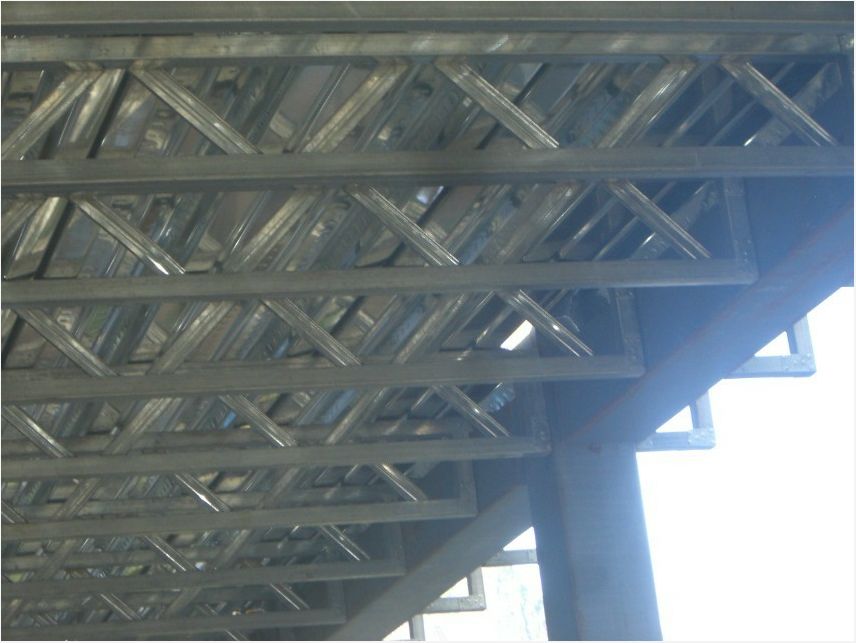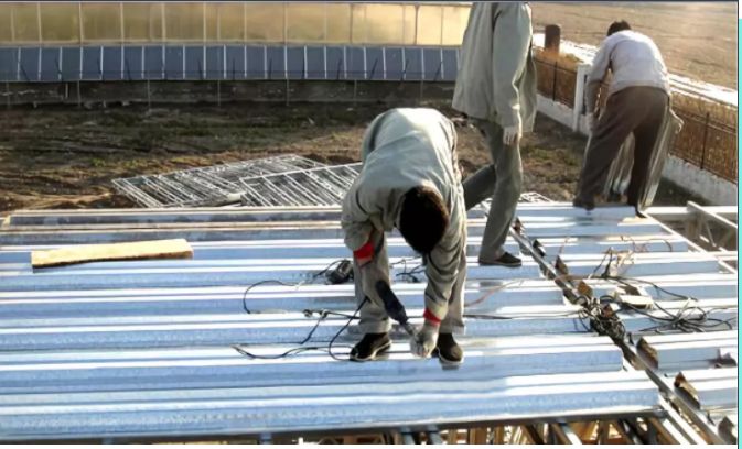 楼承板与楼承板侧板间连接采用咬口钳压合,使单片楼承板间连成整板。先点焊楼承板侧边,再固定两端头,较后采用栓钉固定。