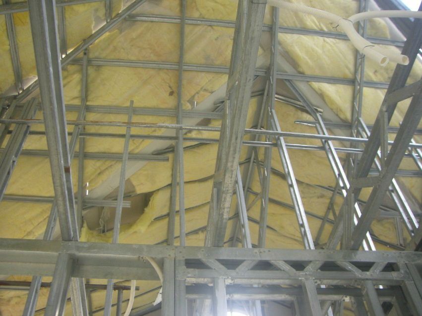 轻钢龙骨的搭建可不是随随便便就行的,一定要按照标准来施工,切莫马虎大意。 轻钢龙骨部件采用螺丝连接,一楼的骨架基本搭建完成。