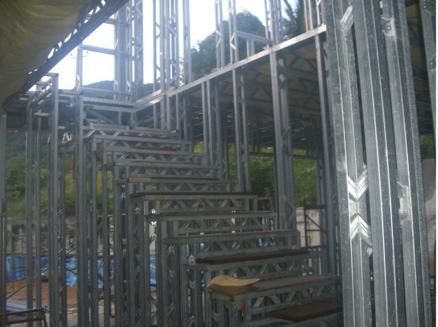 轻钢房屋楼梯结构分为楼梯墙及踏步梁。楼梯墙由立柱、顶导梁和底导梁等部件组成。
