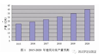 根据中华研普行业调研报告,国内建筑垃圾产量预测图1可知,2015年至2020年建筑垃圾产量逐年增长,到2020年时为39.66亿吨。