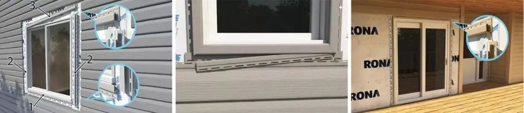 ● 用J形条安装窗户四周,窗户两边的J形条板要比窗户高一点, 在与窗户平齐的地方作标志, 把多出的部分一边切成 45 度内折,可以防水也便于与其他的J形条相接。