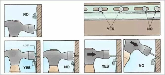 ● 钢钉应垂直钉入墙面,若歪斜会造成挂板走形或翘曲。
