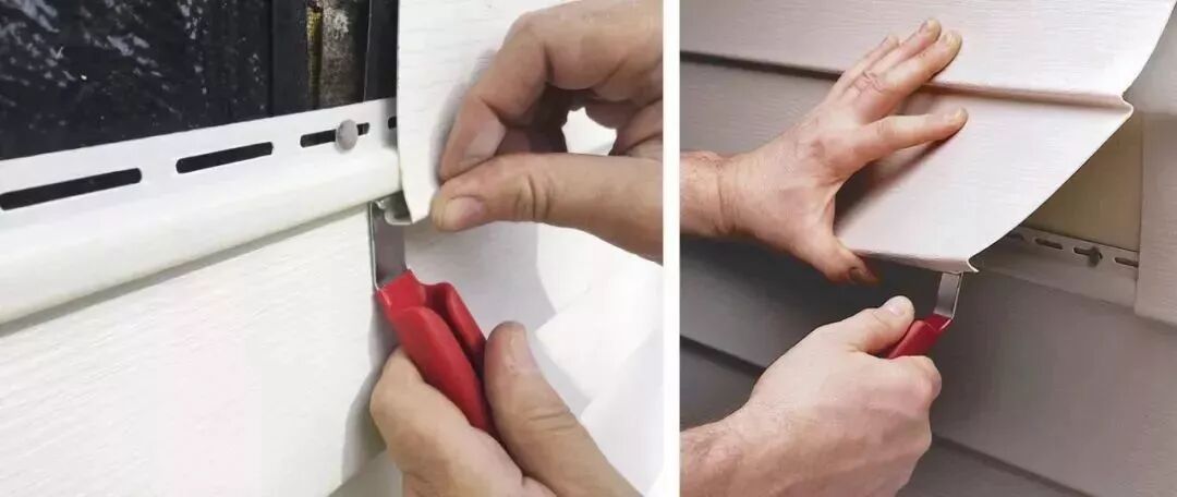 ● 窗台下安装挂板时,先对着窗台的长度在挂板上作出标记,用工具刀截掉多余的部分,用打孔钳在切割边缘每隔 200-400mm 打孔。在山墙上安装挂板时,先把J形条装在山墙顶部,每隔 200-400mm 打钉。挂板之间的搭接处,应该尽量远离入口及来人较多的地方,这样有利于提高整体的装饰效果。