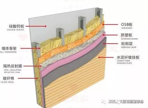 而轻钢别墅主体材料是由冷弯薄壁型钢组建而成的,具有恒温、隔热等性能。其次,墙体分为外墙板和内墙板。外墙主要是由OSB板(欧松板)、防水透气膜、外墙装饰材料组成。透气膜放在保温层和镀铝锌钢板中间,采用特殊的纤维结构,增加了对建筑的保温效果。房顶也是同理,屋面系统由防水卷材(如沥青瓦)、OSB板、防水层和保温棉组成