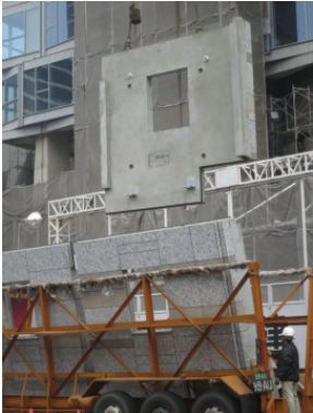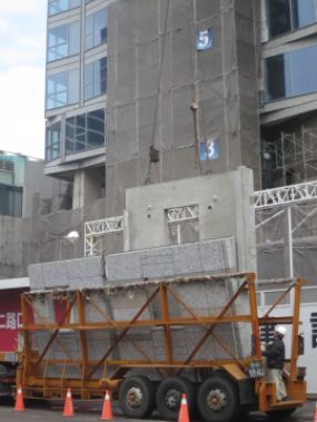 上面这2张建筑外墙板吊装施工的照片,拍摄于2015年11月台湾新北市某栋在建高层钢结构住宅工地大门口,该住宅楼目视有30余层,100多米高,住宅的钢结构主体已经封顶,正在进行内外墙板和内部装修施工,局部外墙板已安装到25、26层。据了解,该住宅楼采用钢核心筒+钢管混凝土柱框架结构,是钢结构住宅常见的结构体系。