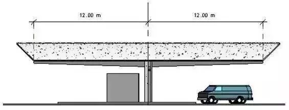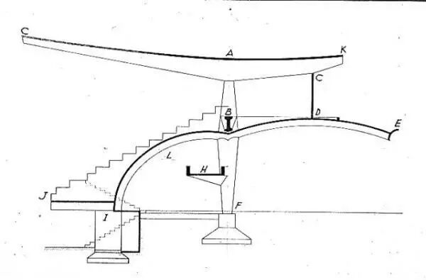 壳体的横剖面是倒悬链拱,这样壳体在重力作用下只存在压力,拱之间的侧向力相互抵消,边缘的侧向力由边梁承担。与上面不同的是,该结构前后对称来平衡倾覆力,单个壳体中拱顶受拉力,因此在拱顶集中埋设钢筋。