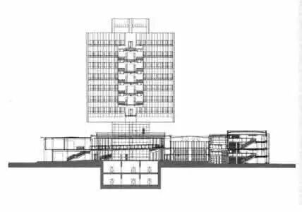 图片中周边的小房子是原有图书馆,因为不能满足要求,需要盖新楼。但是国家给的预算太少,根本无法支撑拆旧楼盖新楼,当时土木学院的老师经过计算,采取了这种预应力悬挑结构,保证了上部空间,同时保留了下部旧楼。在这里,建筑真心是个配角……