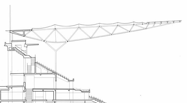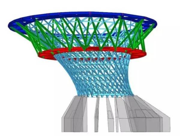 在竞标之初,方案就已经确定以巨大的桁架结构实现悬挑,同时已经确定桁架结构需要由两个支点,而非通常的一个支点来进行支撑,支撑点位置的桁架高度相应更大一些。
