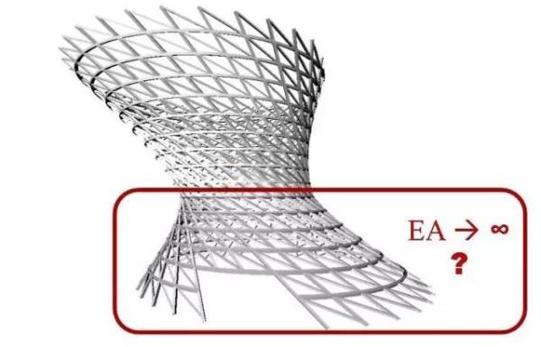 受压杆件不相互接触,造成一种“杆件漂浮在空中”,或者“杆件被绳子撑起”的错觉。结构里的拉索是预张拉的,而不是靠自身重力进行张拉。所以即使把它放倒也不会影响其刚度。