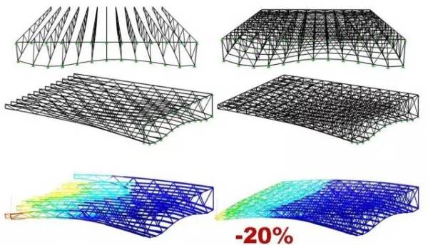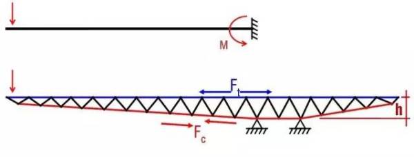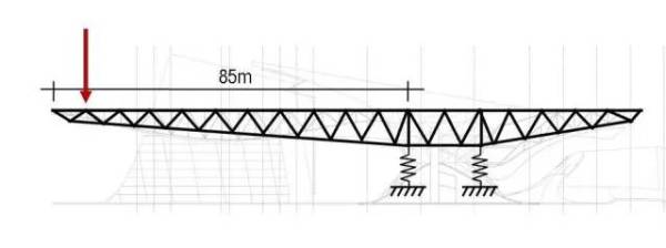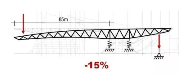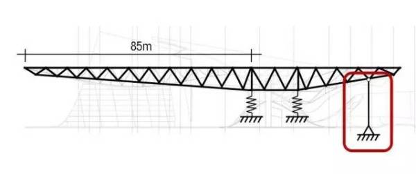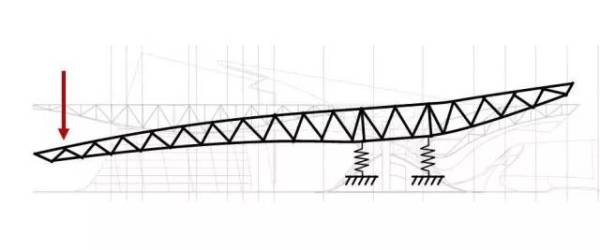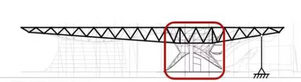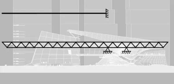 在桁架结构中,上面的杆件受拉,下面的杆件受压。这个悬挑结构从尽端到支撑点的距离有85m,同时也并非一种简单的直线形态——悬臂的下表面崎岖不平,这也对整个桁架的不同截面提出了不同的形态要求。