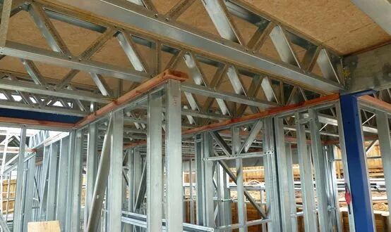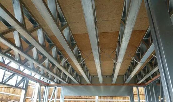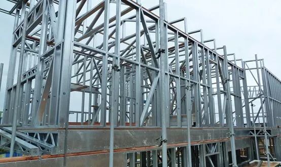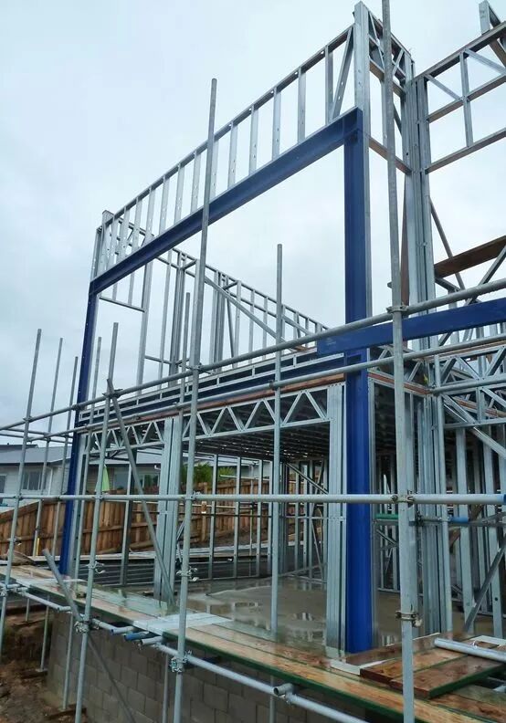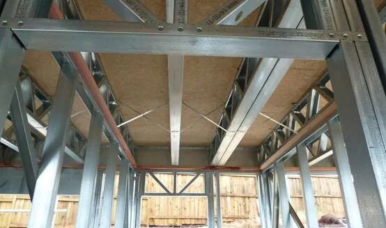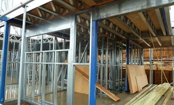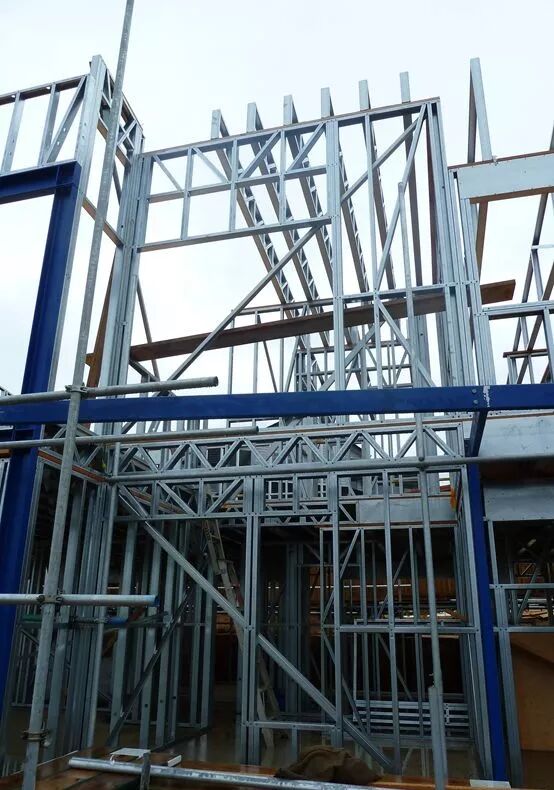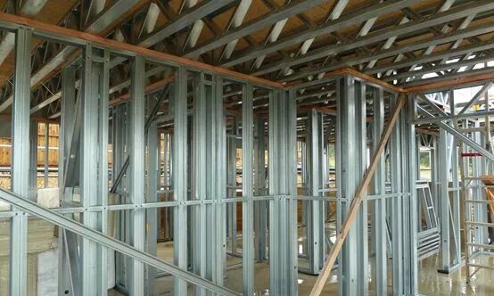 轻钢内部承重墙施工,上图内墙龙骨做了背靠背处理,增加墙体承载力