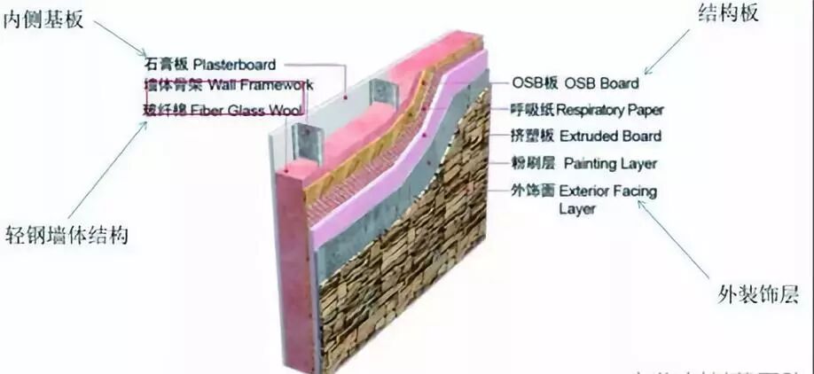 1.外墙对外侧:玻璃纤维棉填充到轻钢结构中,然后分别装钉结构板(即oSB板)、防潮呼吸纸、挤塑板(抗寒保温作用)、装钉钢丝网、粉刷层(两层水泥砂浆,层粗糙、一层光滑)、文化石施工(或挂板、喷涂用户所喜爱的涂料等)作为外墙装饰。
