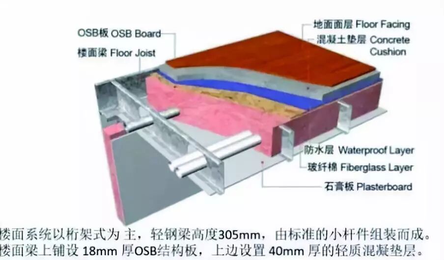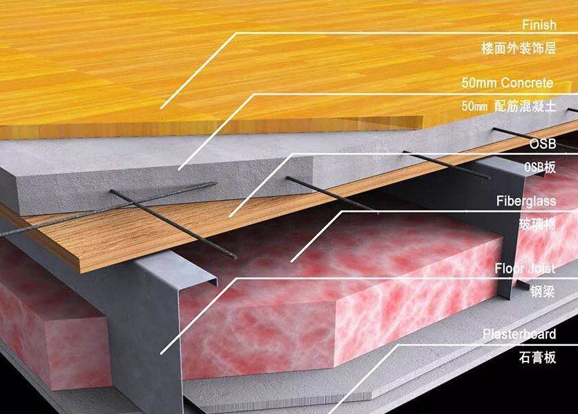 3.楼面楼面梁内填充玻璃纤维棉,上侧按顺序分别装钉结构板(即OSB板),混凝士垫层(湿区地面需铺设轻质混凝土垫层并设置防水层),地面裝饰层(可随意选择安装木地板、瓷砖和地毯等用户喜欢的装饰材料)楼面梁下侧直接装钉一层石膏板