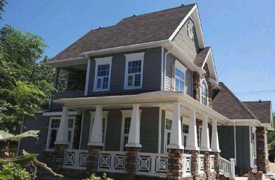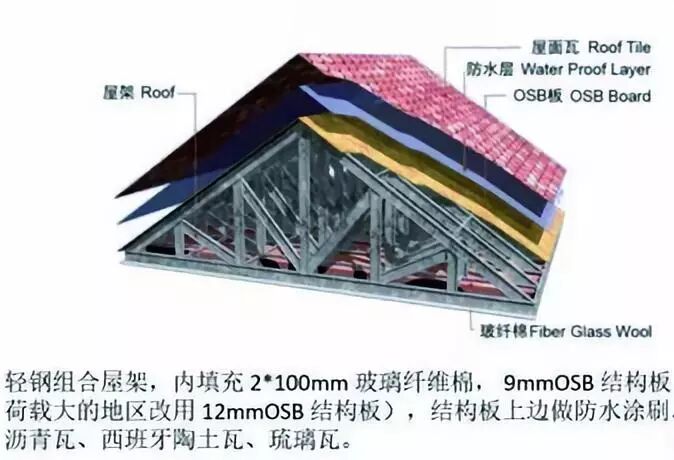 4.屋面(屋顶):将玻璃纤维棉填充到三角屋架或T型屋架底边,对外边按顺序分别裝钉结构板(即○SB板),防水层(凸出/平面一层,凹处两层),屋面瓦施工(屋面瓦可以采用欧式沥青瓦、陶氏瓦和琉璃瓦等不受限制
