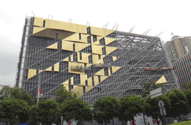 为了使“金色外套”更加华丽,建设团队采用“盒体铜板+轻质隔墙+拉索铜网”幕墙系统,使得由9102块厚0.7毫米的金铜板和1960块穿孔率55%的拉伸金铜网与1.9万平米“碧玉衣”完美融合。