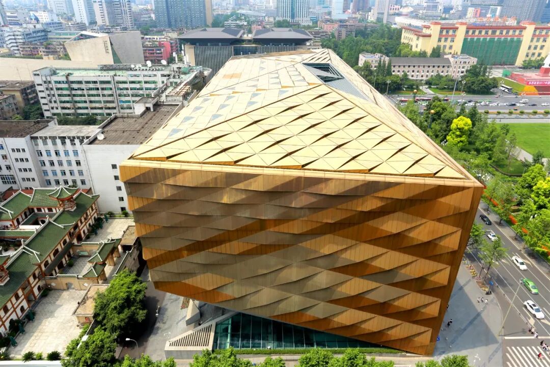 成都博物馆新馆“身穿”一件由穿孔金铜合金金属网编织而成的“外套”,“内搭”通透的“碧玉衣”。在光线的作用下,远远看去,就犹如一块生长在蜀都大地上的“金镶玉”。