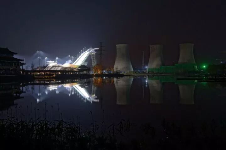 大跳台在首钢园整体偏灰的工业背景下跳脱又并不突兀,在群明湖倒影的映衬下显得尤为灵动飘逸。