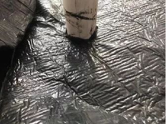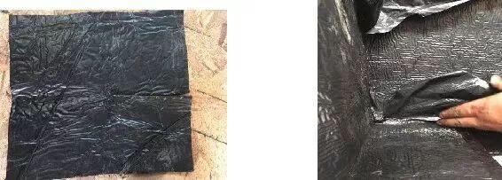 3.1 防水卷材首先从排水口开始铺贴,剪一个直径略小于水管的圆(四周可以切几道小口子),套入水管,使卷材上 卷 20mm;然后把卷材和水管接口处按压密实;再从里往外、 从低出往高出依次铺贴防水卷材。