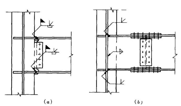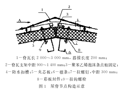 屋脊板、高低跨相交处的泛水板与屋面彩色压型钢板的连接采用搭接连接,其搭接长度不宜小于200mm ,搭接部位应设置挡水板和堵头,屋脊板之间搭接部位的连接件间距不宜大于50mm。施工时将钢板向上翻起30mm ,能有效地防止雨水从接口处进入室内造成渗漏。屋脊节点构造如图1所示。