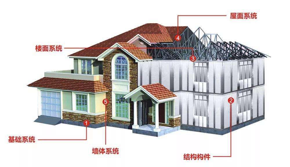 轻钢别墅定制板墙组合结构由墙体系统、基础系统、楼面系统、屋面系统等通过结构构件组合而成。