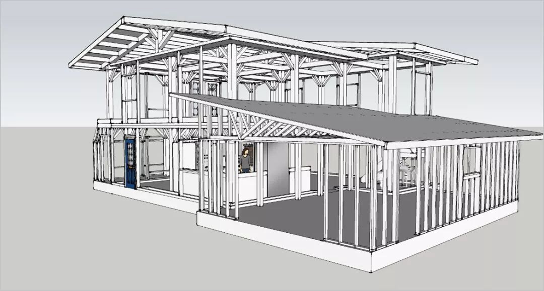 屋面OSB板施工时要着重注意防水问题,板接缝处应加铺一层防水胶带,整个屋面OSB板安装完成后敷设一层防水卷材,且卷材接缝与板接缝应有效错开。屋檐泛水收口也应用防水层覆盖,防止水气渗入。屋面一般采用12mm厚B3级的OSB板材。