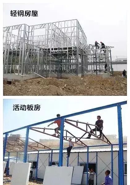 活动板房:以工字形做框架,外墙采用彩钢板搭建,轻钢为骨架,以夹芯板为围护材料,以标准模数系列进行空间合,构件采用螺栓连接,比较简单,安全实用,适合工地临时性建筑,可重复循环利用。