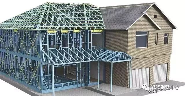 低层别墅的屋面大都为坡屋面,因此屋面结构基本上采用的是由冷弯型钢构件做成的三角型屋架体系,轻钢构件在封完结构性板材之后,形成了非常坚固的"板肋结构体系",这种结构体系有着更强的抗震及抵抗水平荷载的能力,适用于抗震烈度为8度以上的地区。