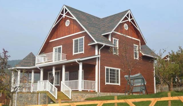 轻钢别墅采用独特的夹层式设计,在轻钢骨架上铺设有EPS板石膏基和防水系统,而在最上层的屋面瓦装饰,则根据客户的不同需求配置。