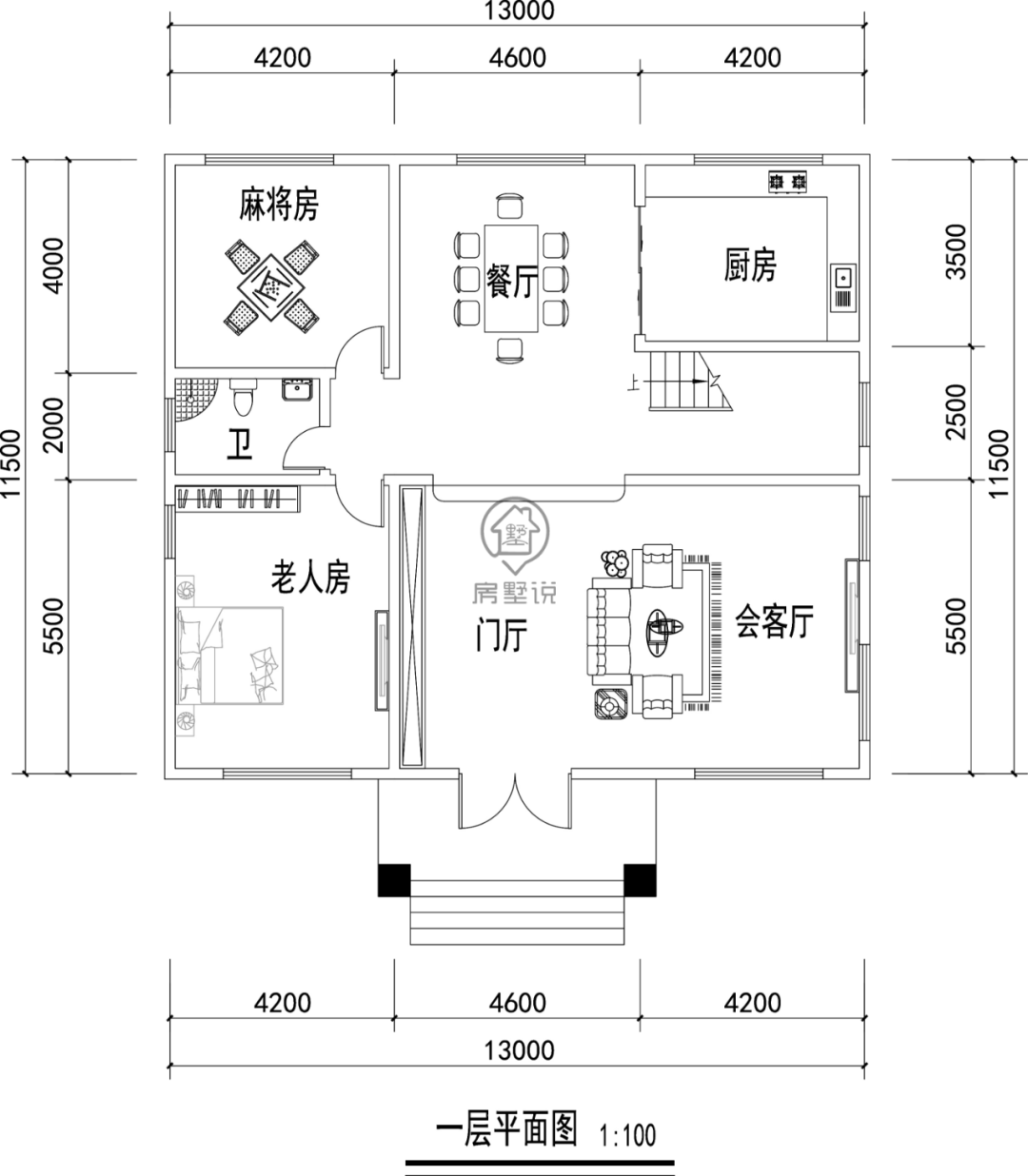 别墅一层设有门厅,客厅,餐厅,厨房,麻将房,卧室,卫生间。