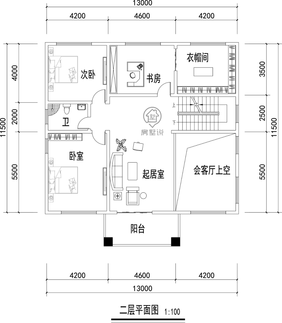 别墅二层设有起居室,两个卧室,书房,衣帽间,卫生间,阳台。