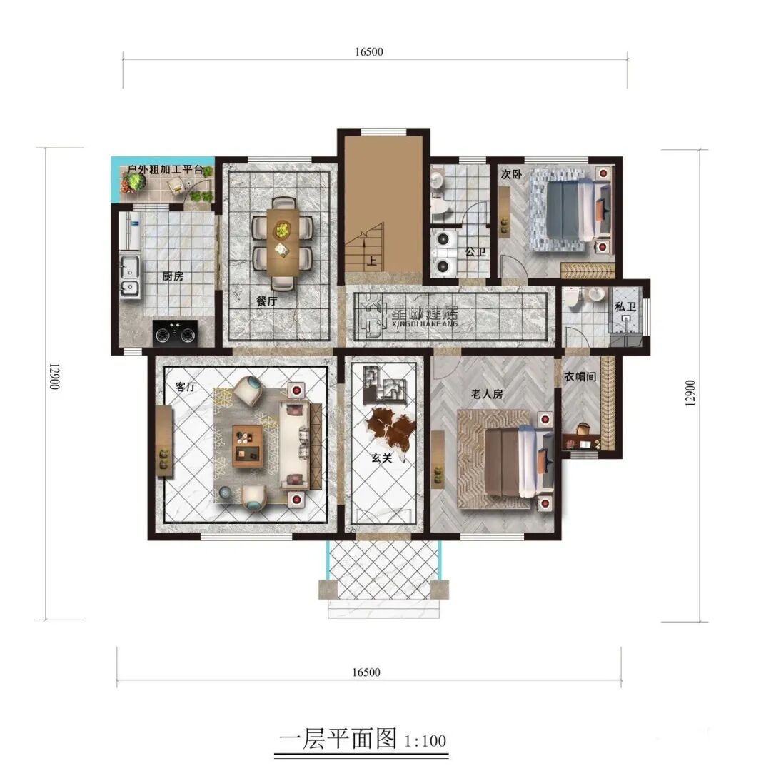 一楼室内设计功能:玄关、客厅、餐厅、厨房、老人房、衣帽间、次卧室、公卫、私卫、储蓄间。室内设计齐全,生活便捷。