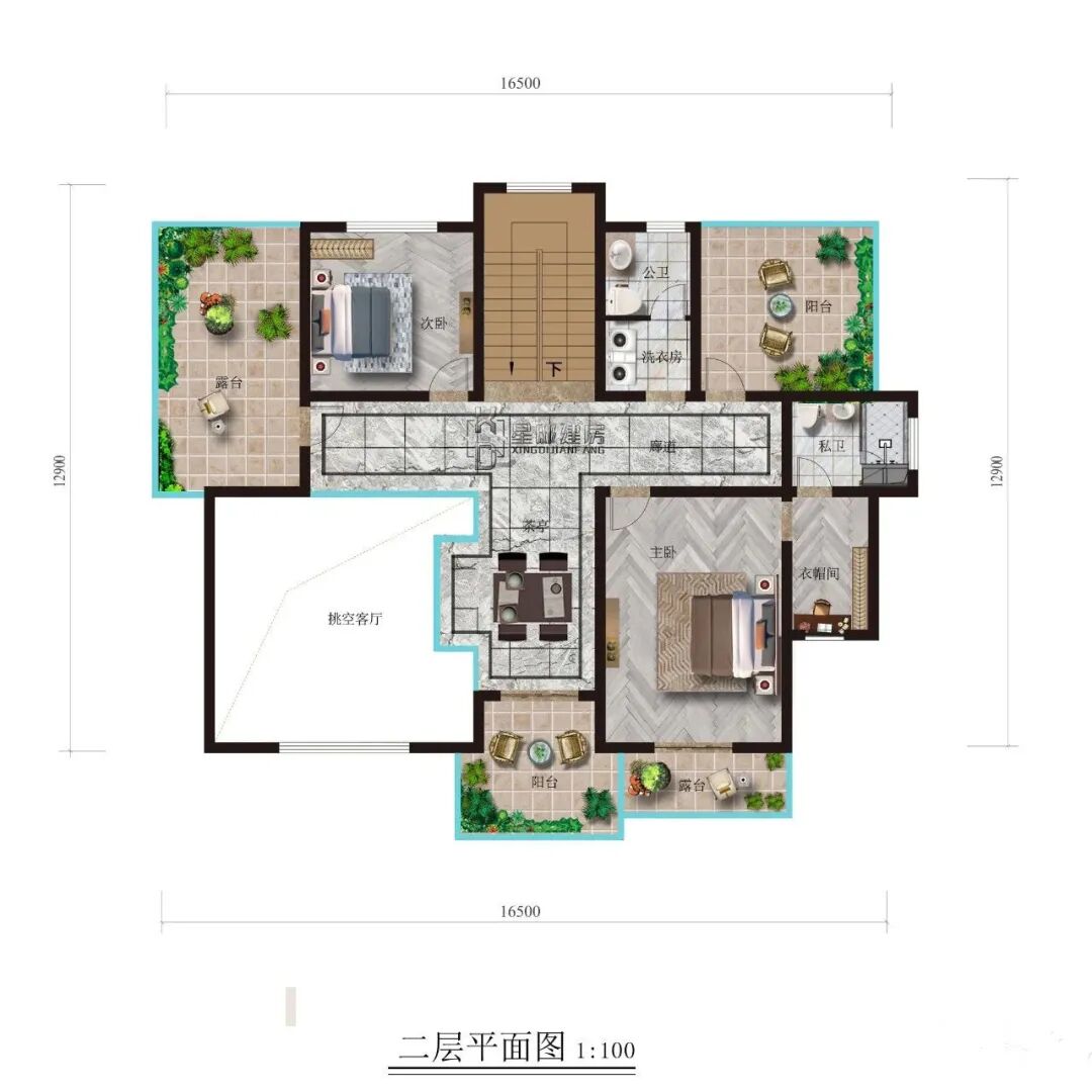二楼室内布局:茶室外带超大挑空客厅和小阳台。主卧室配有衣帽间和私人卫生间,外带小露台。次卧室外带大阳台,提高客人居住舒适度。楼梯间隔壁设有生活阳台、公共卫生间、洗衣房。生活娱乐多样化,属于年轻人的空间。