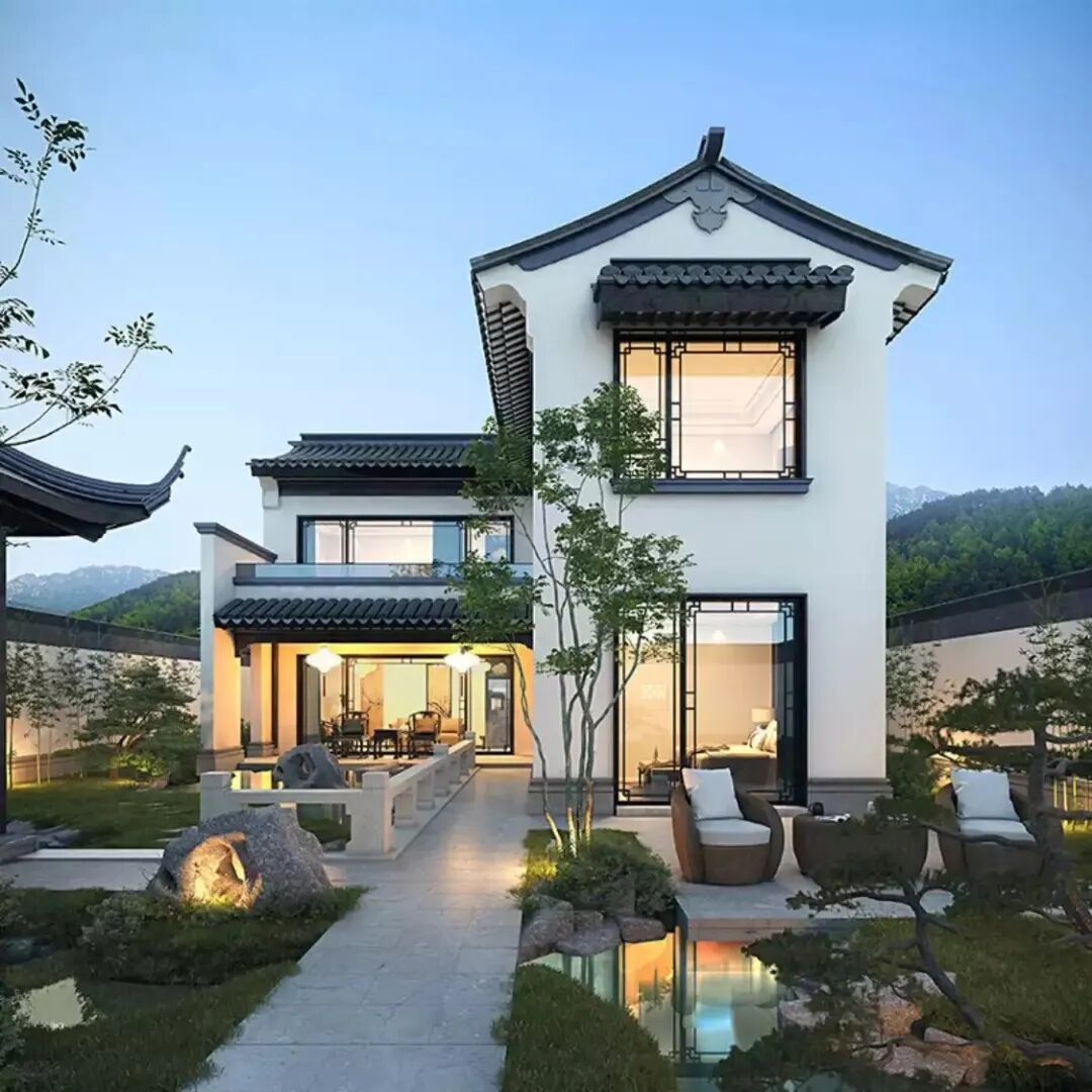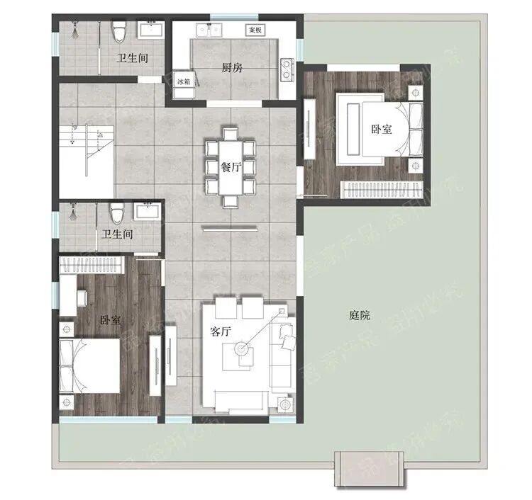 一层设有:客厅、餐厅、厨房、老人房(附卫生间)、公卫、次卧、庭院