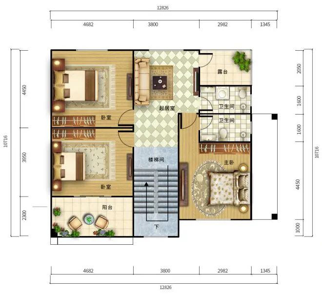 二层设有:起居室、主卧(附卫生间)、3卧室、卫生间、阳台