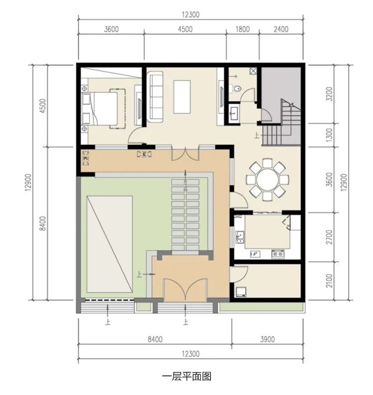 一层设有:客厅、餐厅、厨房、卫生间、老人房
