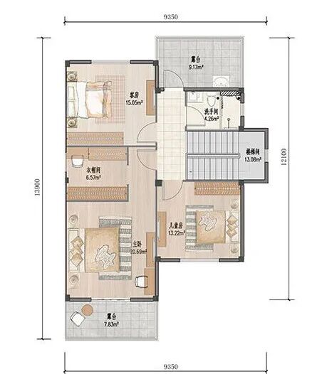 二层设有:主卧(衣帽间、卫生间)、儿童房、公卫、客房、露台