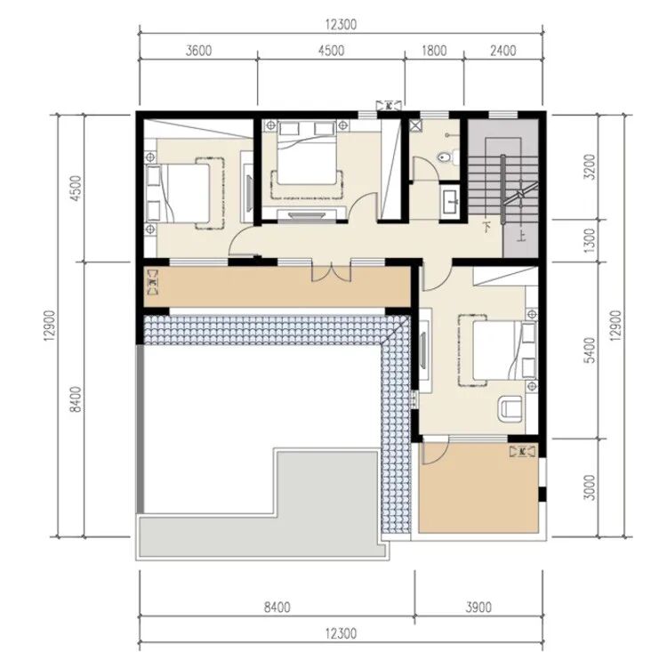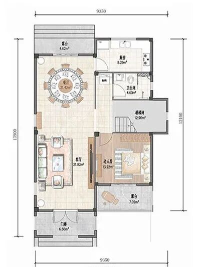 一层设有:门廊、客厅、餐厅、老人房、厨房、卫生间、楼梯间、露台