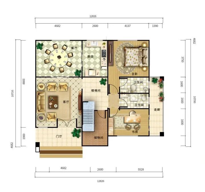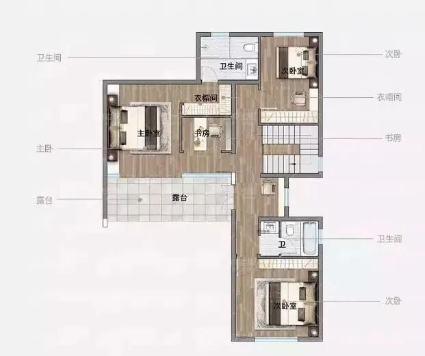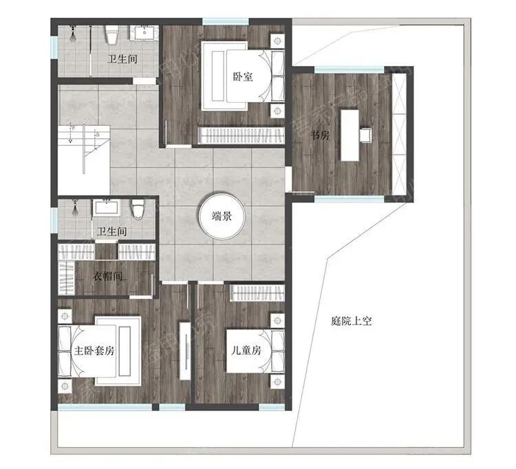 二层设有:主卧套房(衣帽间、卫生间)、儿童房、公卫、次卧、书房