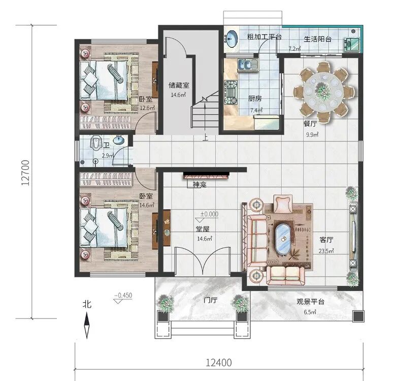 一层设有:堂屋、客厅、餐厅、厨房、生活阳台、2卧室、卫生间、储藏室、门厅、观景平台