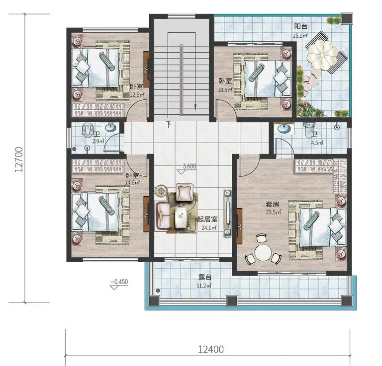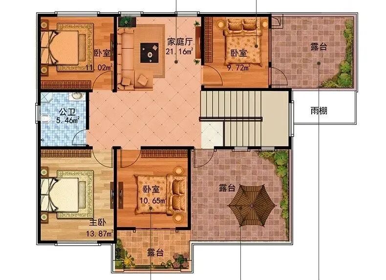 二层设有:主卧(附卫生间)、次卧(阳台)、客卧、起居室、露台、公卫