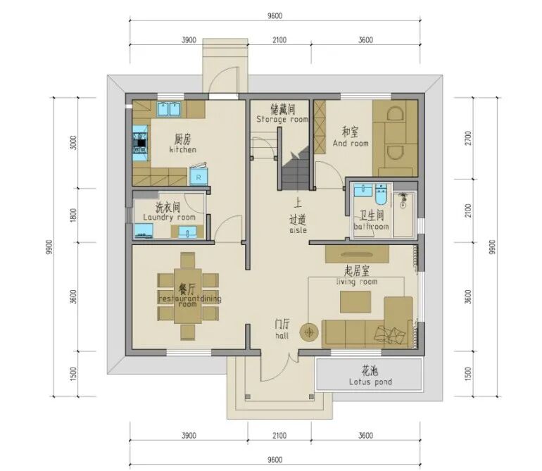 一层设有:门厅、客厅、餐厅、厨房、洗衣间、储藏室、卫生间、和室