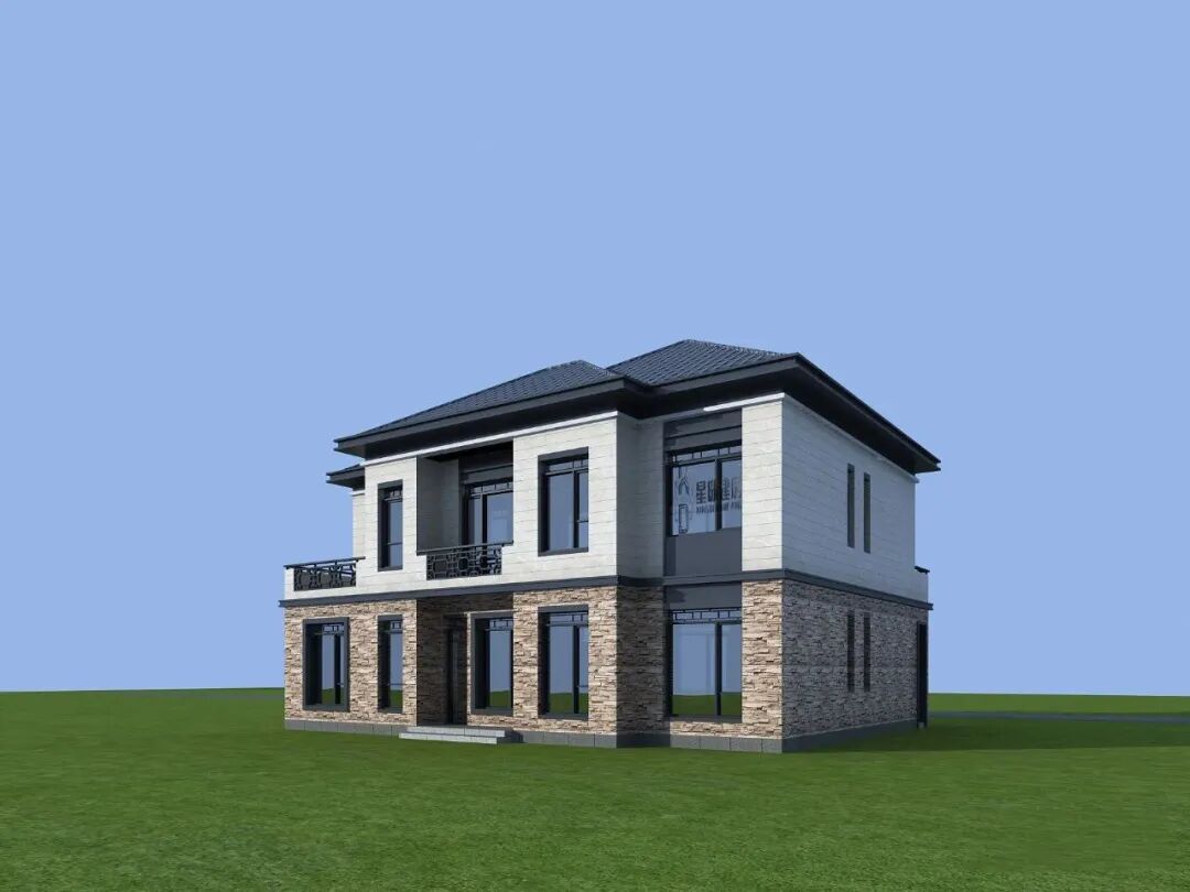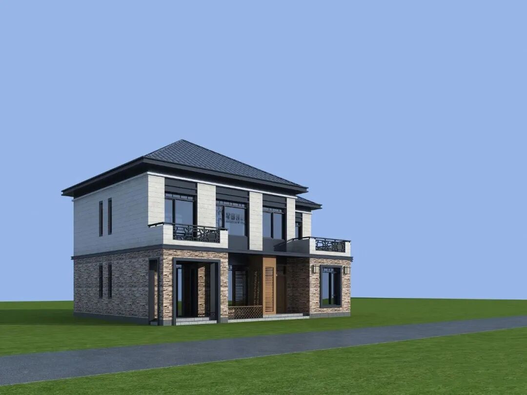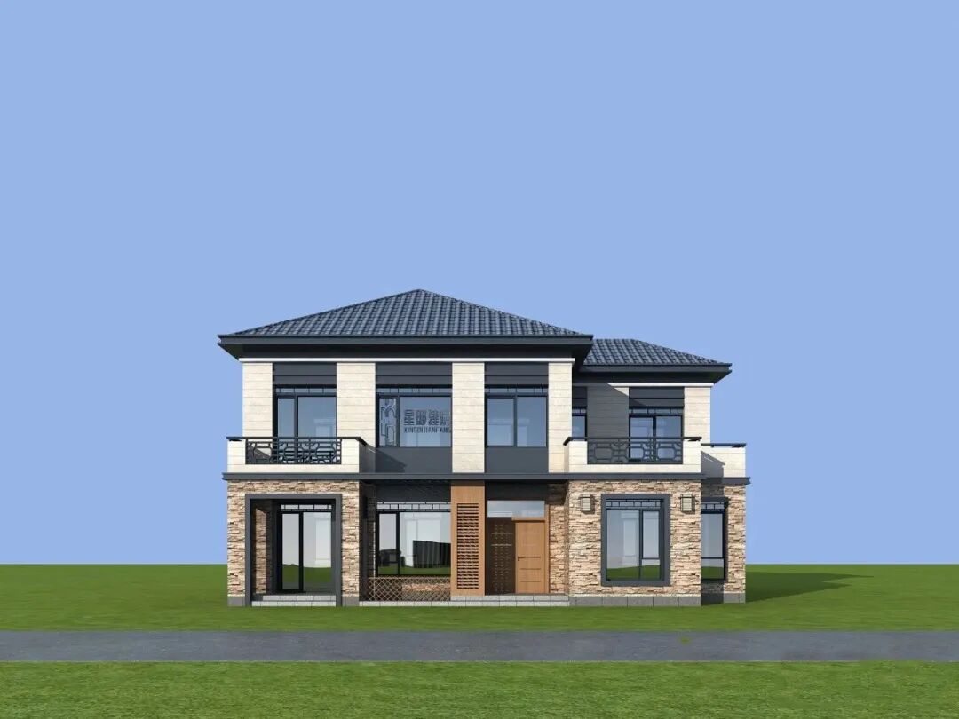 建筑整体风格为新中式风格,一层采用棕色花纹文化石装饰,二层采用白色真石漆,两者搭配在一起,显得清新优雅。