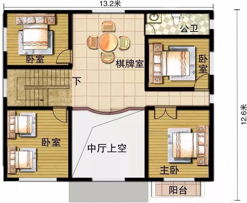 二层设有:棋牌室、四间卧室、一间卫生间、一个阳台。