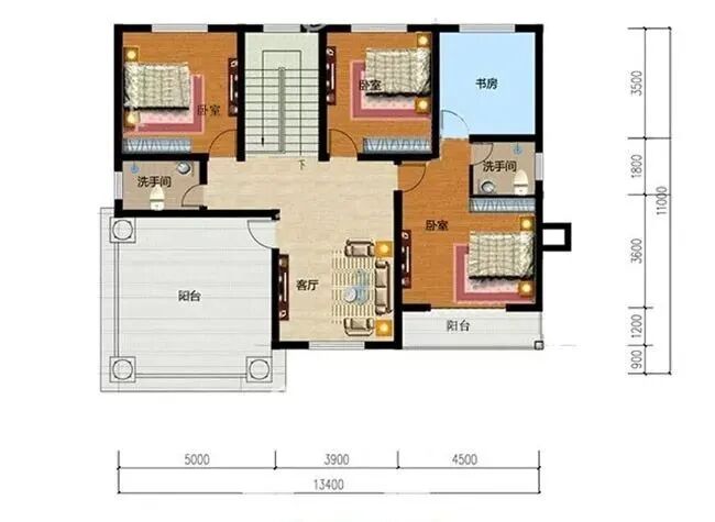 二层:起居室、卧室(附卫生间)、卧室(附书房)、卧室、卫生间、晒台。