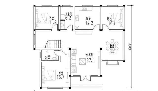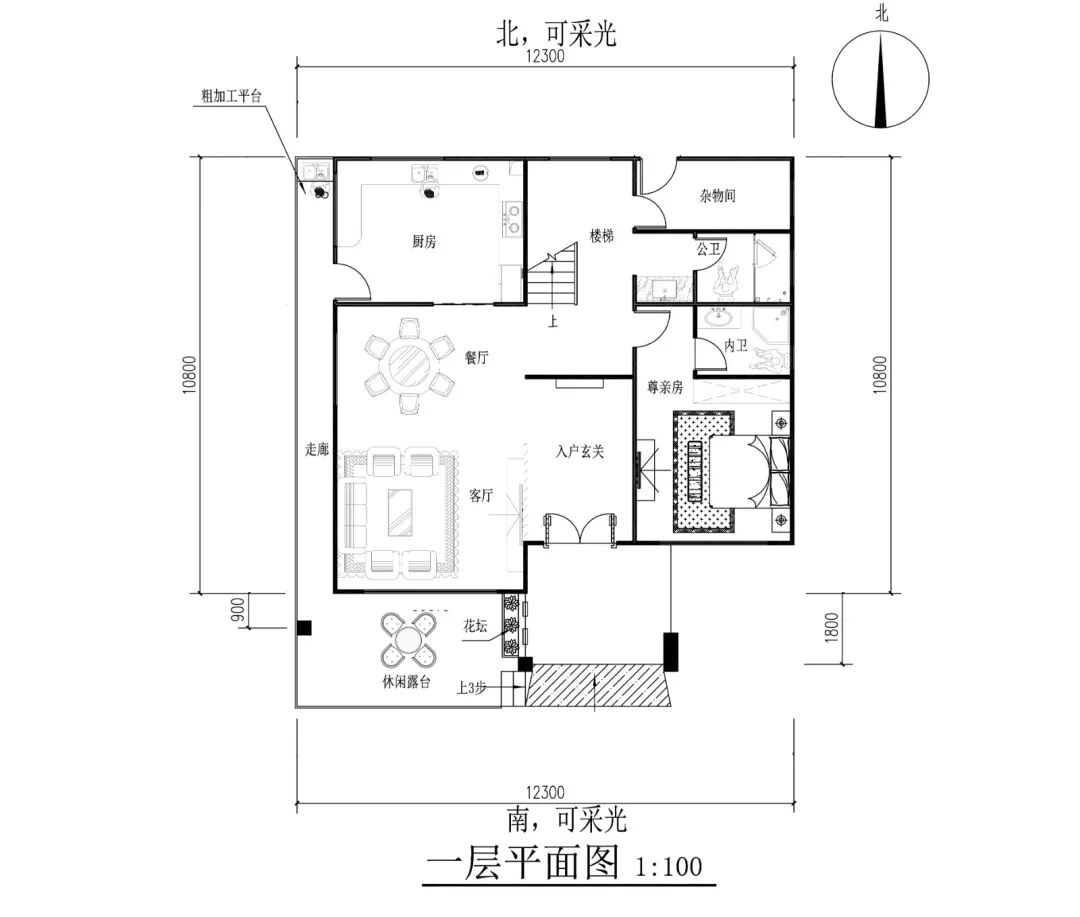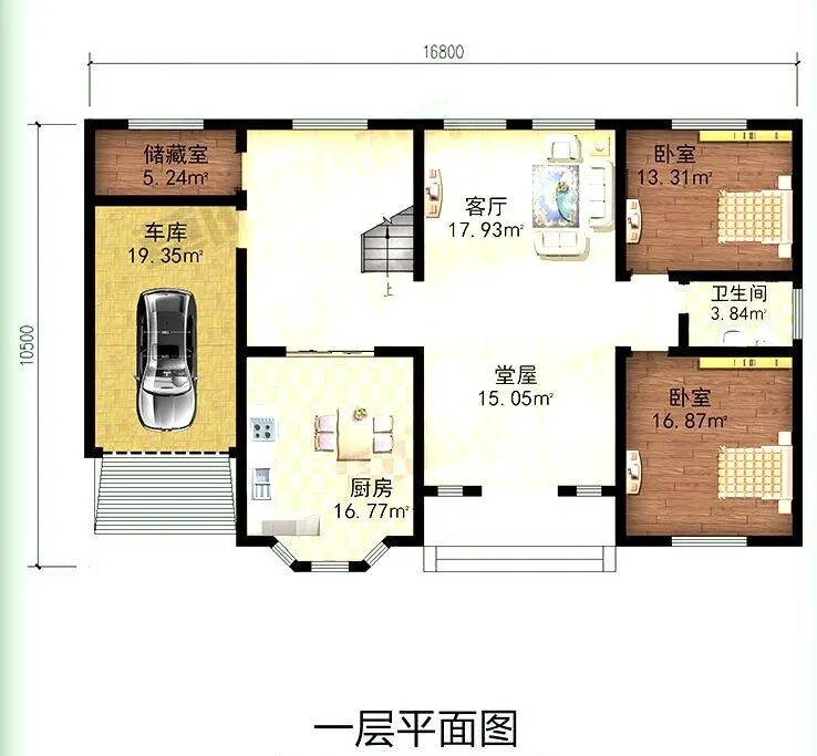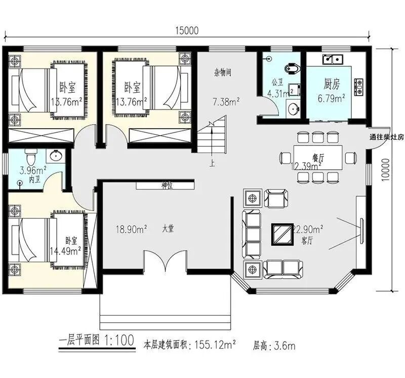 一层有:门厅、客厅、神位、厨房、餐厅、储藏间、两间卧室、一间卫生间;